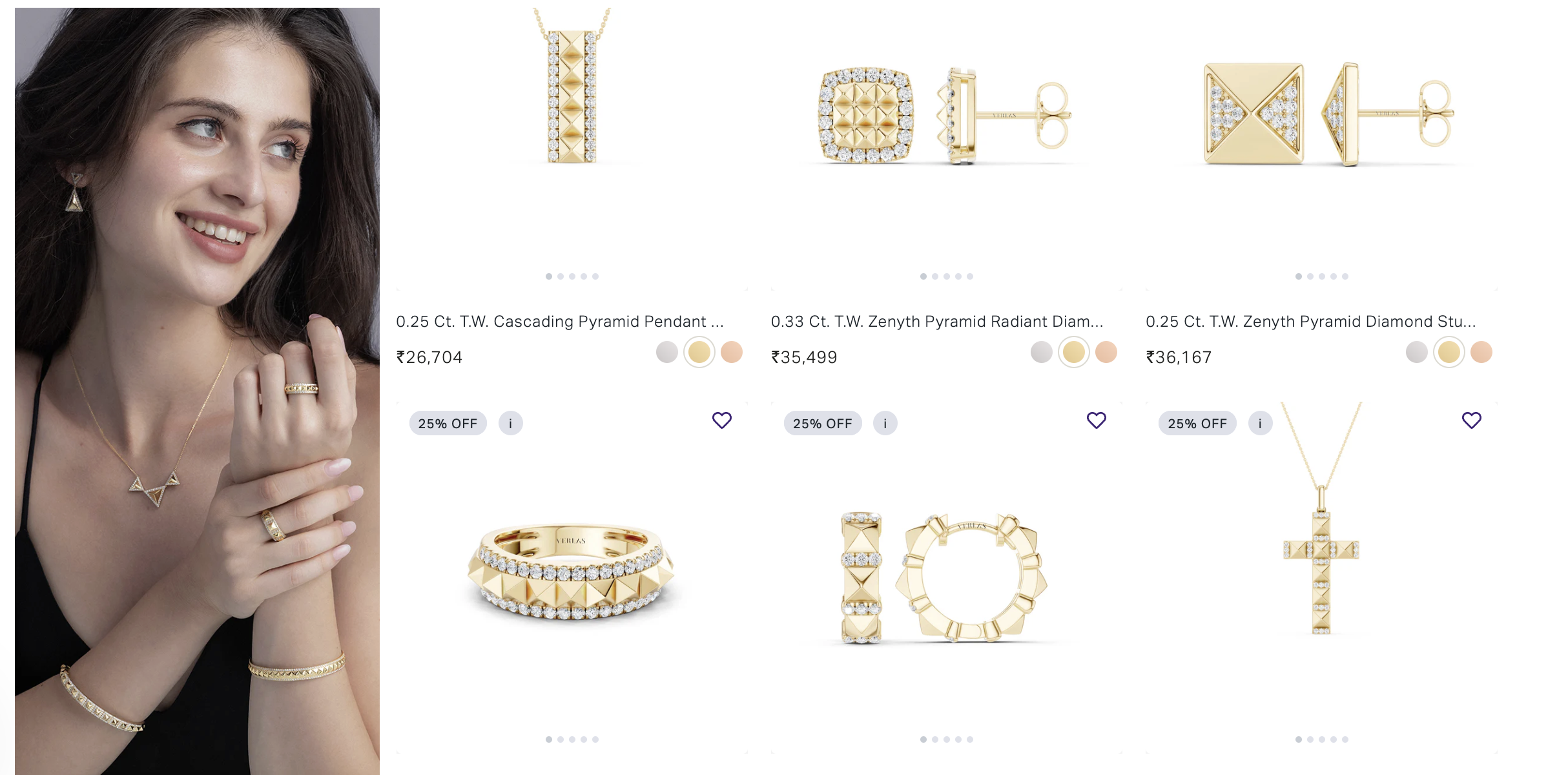 The collection includes a variety of categories, such as the Pyramid Trois Pendant Necklace and the Two-Tier Pyramid Diamond Band, designed for both individual wear and stacking.